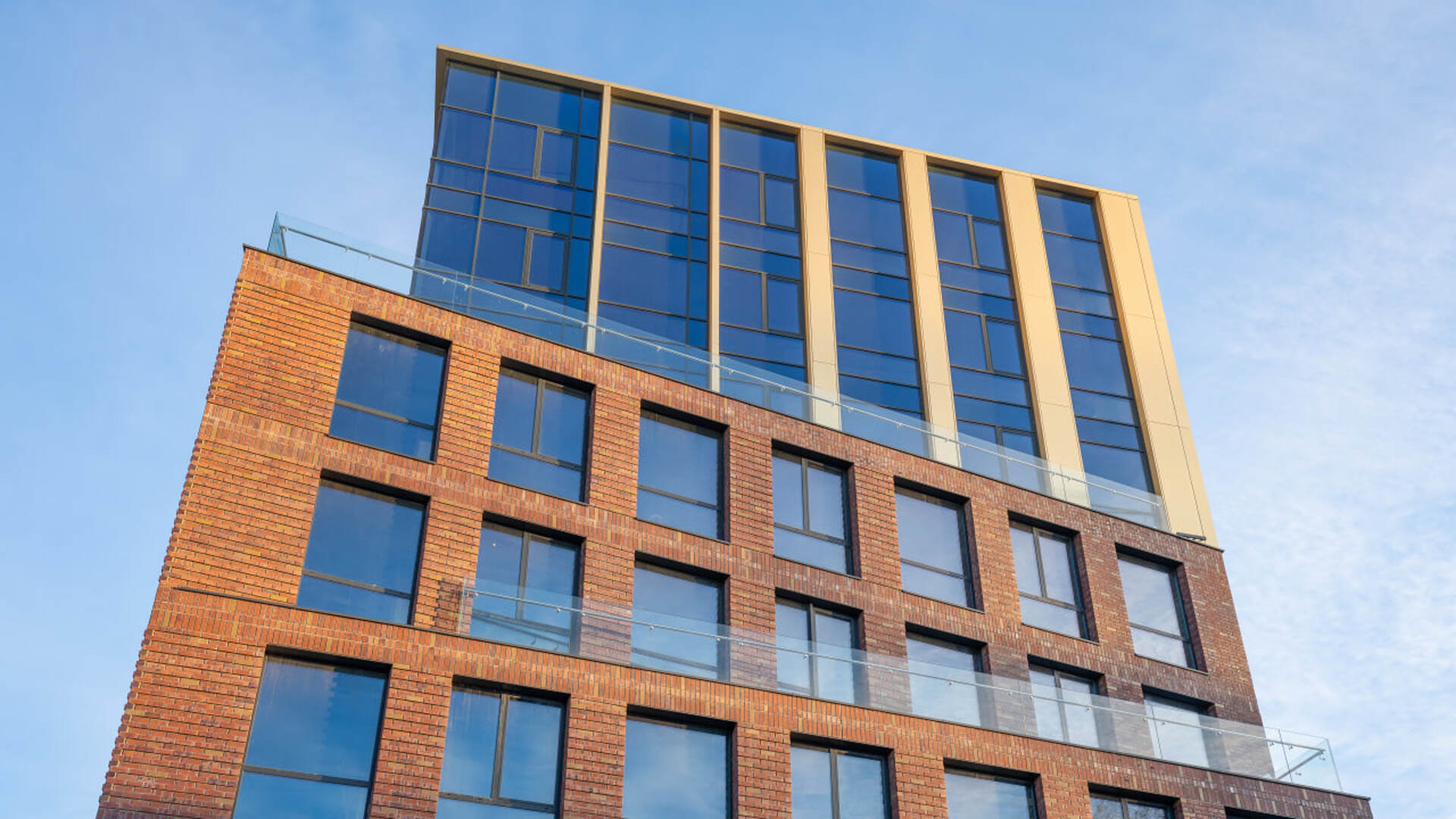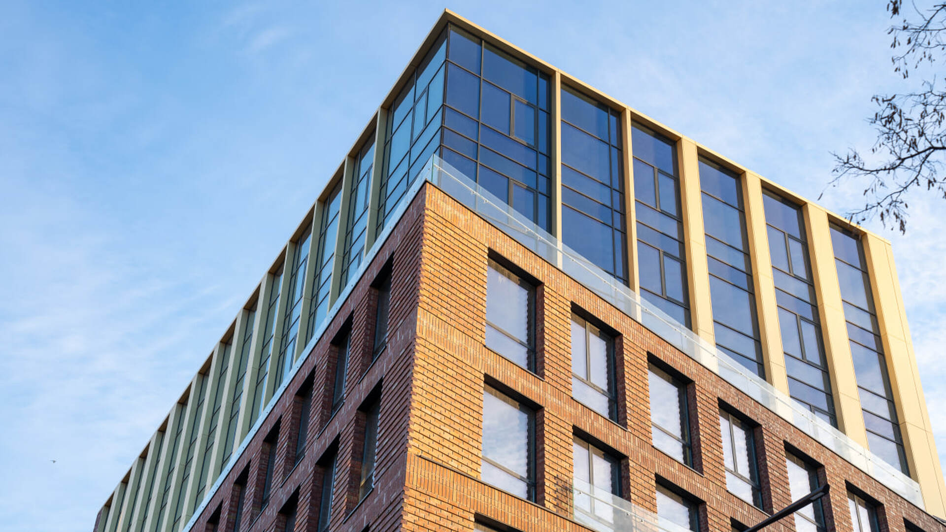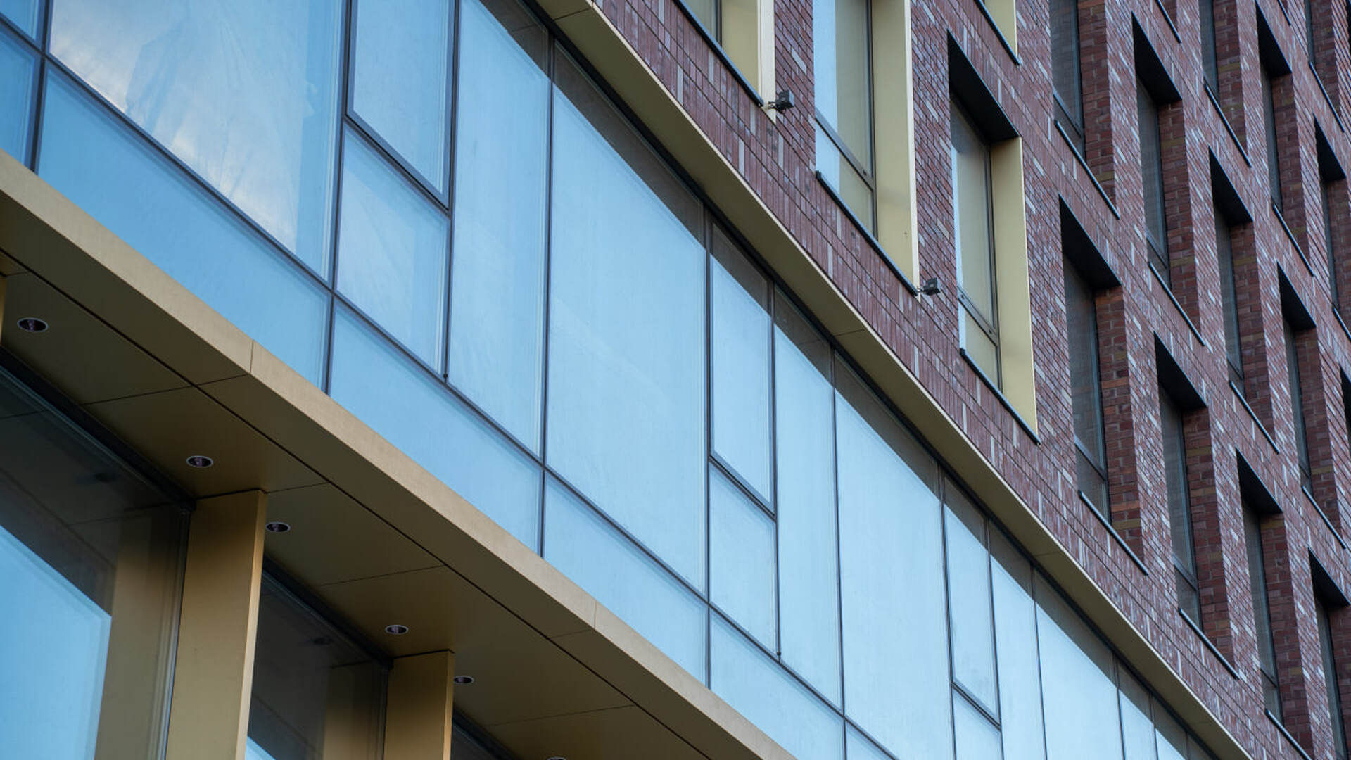 Мета проєкту – це об'єднання віконного, структурного та класичного фасадного скління, а також поєднання ніжних небесних кольорів скла з унікальним золотим композитом та брутальною цеглою.